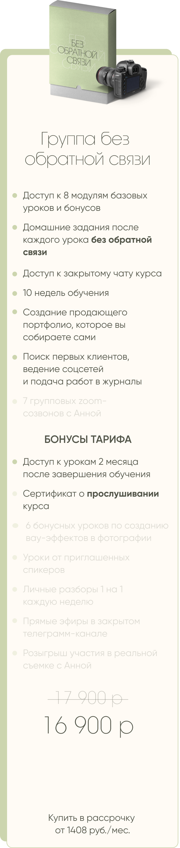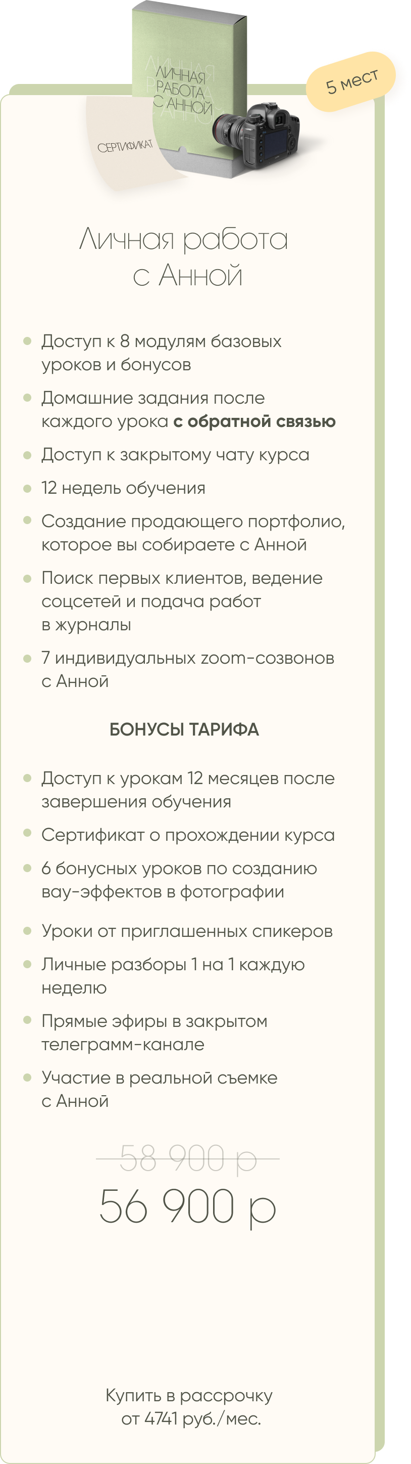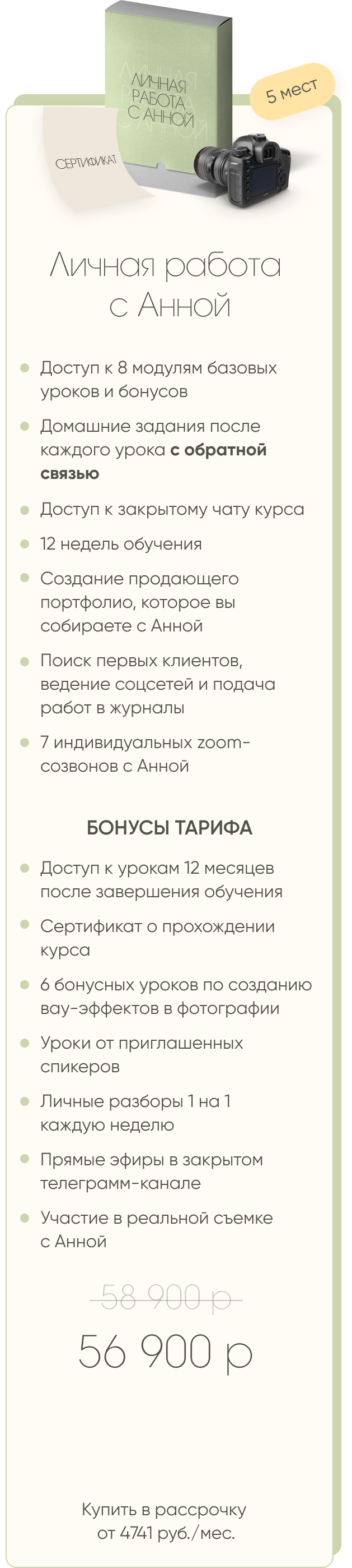 Я занималась на курсе по свету и композиции у Анны Захаровой. Учителя я выбирала осознанно, исходя из своих целей и интересов. Ситуация у меня была, наверное, как и у большинства — после покупки зеркалки я также пробовала снимать все подряд, как на мыльницу — пейзажи, птиц, цветы, друзей, но в какой-то момент вся эта бессистемность съёмки привела к потере интереса, фотоаппарат просто лежал на полке, это при том, что процесс съемки я люблю, как таковой. В какой-то момент я решила, что надо учиться, начала читать книги, пробовала смотреть марафоны от фотографов, так и познакомилась с Анной. Для меня ее работы выделялись на фоне остальных, поскольку я сначала увидела фотографии, подобные художественным картинам. А когда узнала о документальной серии о Карелии — это был полный восторг, и уверенность, что это тот фотограф, у которого я хотела бы учиться. Сомнения были по поводу моих собственных способностей, стиль Анны казался сложным. Я видела много коммерческих работ фотографов, но интуитивно хотелось познать и фотографию как вид искусства, со своими канонами и смыслом. И, конечно, я думаю, что, изучая второе, более сложное, создавать просто красивые кадры для соцсетей будет намного проще, чем наоборот. Анна открыла мир фотографии именно с интересующей меня стороны! Мы не просто изучали свет и композицию –собственно, это только средства для передачи идеи, а она должна быть. Разумеется, от меня зависит, буду ли я дальше применять полученные знания и как, но определенно благодаря обучению взгляд на создание фотографии изменился. Хочу обратиться к тем, кто еще думает и сомневается, как и я два месяца назад. Вообще, специалисту в своем деле виднее, как лучше и что лучше изучать. Поэтому программа Анны составлена с учетом на постепенное погружение в законы мира фотографии. При систематических занятиях информация отрабатывается и укладывается в голове на практике. Поэтому старайтесь выполнять все задания вовремя! Что касается времени — у меня тоже с ним совсем плохо, как у любого взрослого, занятого человека. Помогают только самодисциплина и желание. За 2 месяца занятий с Анной было все — и коронавирус с 39, и 2 проверки инспекций на работе, и защита диплома мужа и много чего еще. Но вечером я брала камеру и шла на улицу — таким образом, одновременно выполняла задание, и отдыхала. И была удивлена, когда Анна сказала, что у меня начинает получаться, т. к. мне кажется, что делала я очень мало. Во всяком случае, по сравнению с тем, сколько хотела бы делать. Что еще важно — Анна человек деликатный. Ошибки спокойно разбираются, с объяснением. Поскольку разборы недостатков очень важны для развития, важен и характер учителя. Например, я люблю фотографировать и так увлекаюсь, что иногда снимаю все подряд. Поэтому потом разобрать, какой кадр просто красив, какой на самом деле может быть интересен — для начала вообще сложно. Анна сделала идеальную установку на основе моих работ, чтобы я знала, на что обратить внимание при съемке, и как потом отбирать фотографии. Кстати, именно Анна обратила внимание, что один сюжет на моих фотографиях повторяется, и посоветовала сделать проект, над чем я и сейчас продолжаю работать.